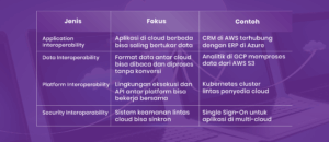 Cloud interoperability bicara soal bisa saling bekerja sama dan bertukar data antar sistem cloud tanpa harus dipindahkan. Jenis-jenisnya lebih ke bagaimana mereka terhubung dan saling mengerti.