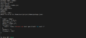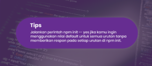 Perintah ini adalah alat untuk membuat struktur package.json untuk proyek kamu. Dengan menjalankan perintah ini kamu akan diminta memberikan informasi proyek sesuai dengan urutan seperti berikut: